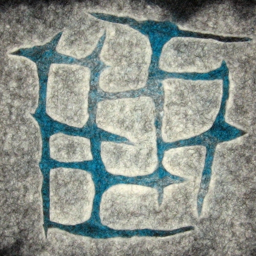 Mit Hilfe der Schollentechnik können interessante Oberflächenstrukturen erzeugt werden. Bei dieser Technik werden zwischen die Wolllagen gerollte Folie oder Kunststoffbänder eingefilzt. Das Werkstück wird nun entweder fast fertig oder ganz fertig gefilzt und gewalkt, je nachdem wie stark der Effekt der "Schollen" sein soll. Wenn dies geschehen ist, wird mit Hilfe einer spitzen Schere die obere Wollschicht bis zur eingefilzten Folie aufgeschnitten. Entlang der Folie wird nun weiter geschnitten. Sehr vorsichtig, damit nicht durch das gesamte Filzstück geschnitten wird. Wenn alle Folien oder Kunststoffbänder aus dem Werkstück herausgeholt wurden, ist das Werkstück entweder fertig oder wird noch fertig gewalkt. Je länger anschliessend gewalkt wird, desto undeutlicher sind die Schollen später zu sehen. Sollen die Schollen klar und deutlich hervortreten, dann wird nicht mehr gewalkt.