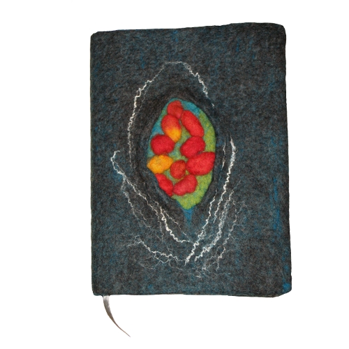 Dieser Umschlag umhüllt einen A5-Kalender. Durch aufgefilzte Filznuggets entsteht eine sehr interessante Oberflächenstruktur.