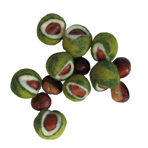 Eingefilzte Kastanien als Dekoration für den Herbst.