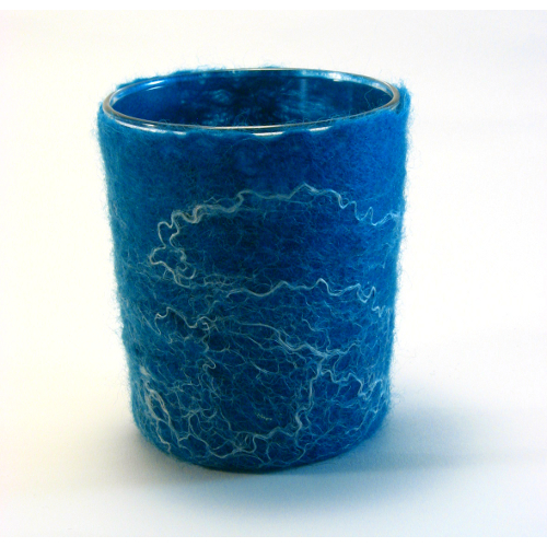 In der gefilzten Hülle dieses Windlichts wurden zarte Seidenfasern eingearbeitet. Die Beleuchtung durch eine Kerze bringt die Struktur der Fasern besonders gut zur Geltung.